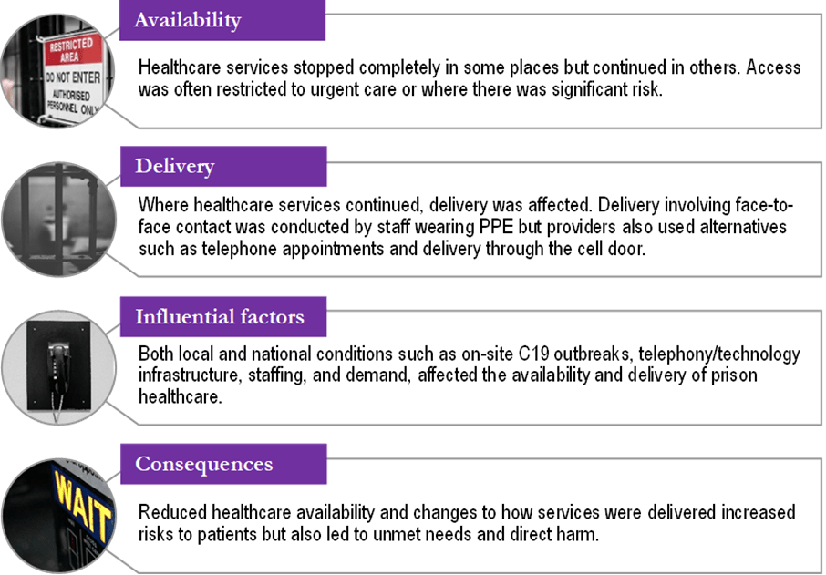 Despite the variations observed, we identified some commonalities across the prison estate: most non-Covid related healthcare was initially suspended at the onset of the pandemic; subsequent availability and delivery was influenced by local conditions; and harm, unmet need and immediate and long-term risks to health resulting from changes to healthcare were universally reported.
